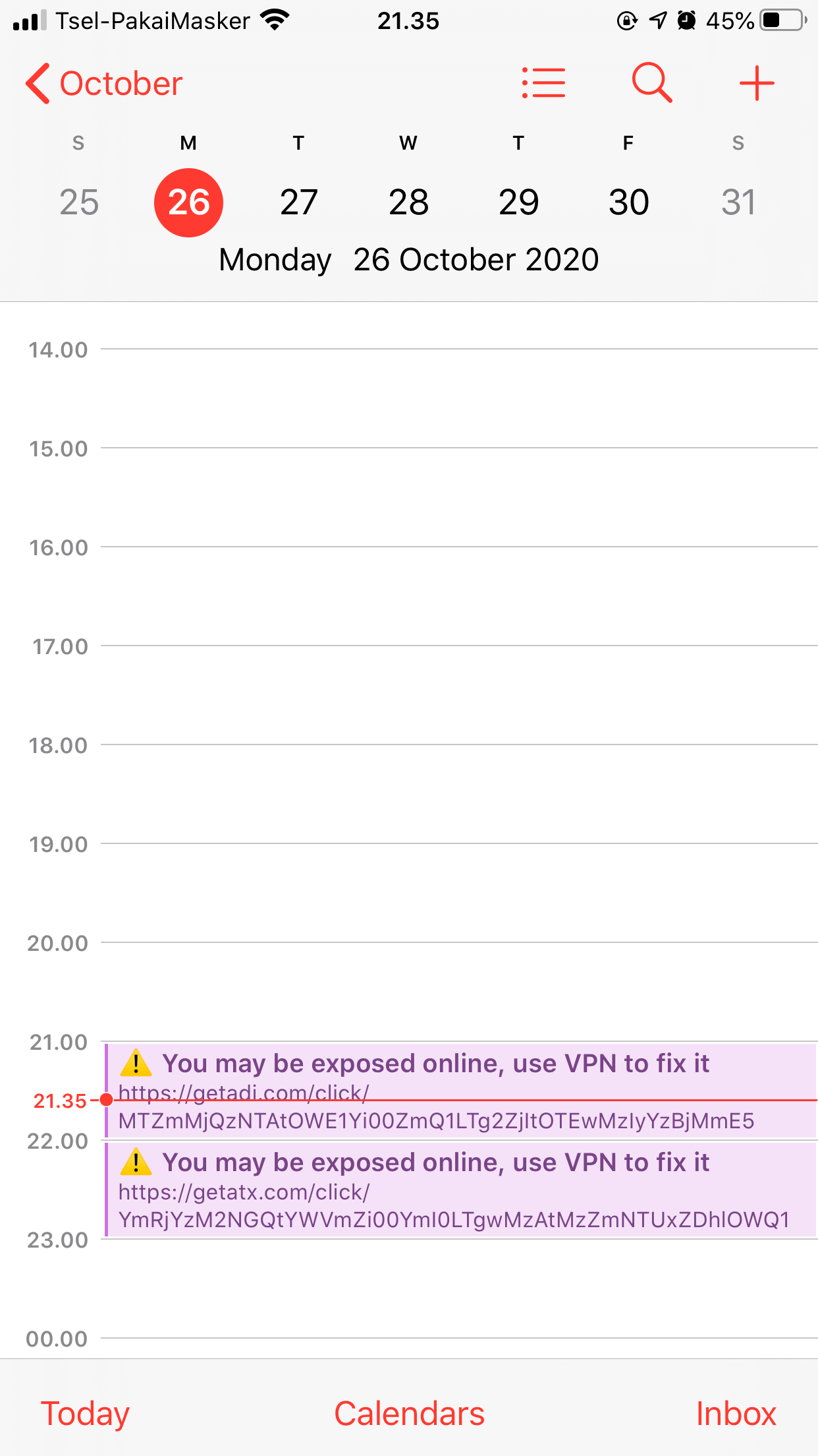 It appears this is the latest way to spread spam. The events are either in a subscribed calendar, or an email account with calendars turned on. You got tricked into installing a rogue calendar; Calendar spam is a way for scammers to insert nonsensical claims, offers, and warnings with potentially harmful links into your calendar, which triggers notifications on your.