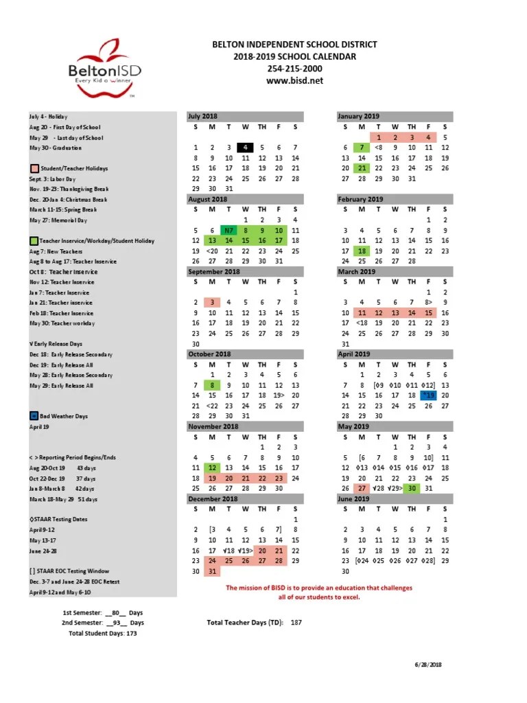 Find the annual school calendar, academic calendar, and class schedules for. View the calendar of belton school district, a public school district in missouri. View the school year dates, holidays, and reporting periods for belton independent school district. View the academic calendar for belton high school, part of belton school district #124. View the school year calendar for belton independent school district, including holidays,. Under the newly adopted belton isd calendar, the first day of school will be aug.