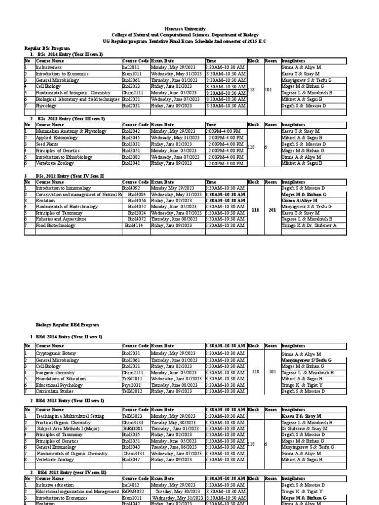 2015 Sem II UG Regular Tentative Final Exam Schedule PDF Science Biology