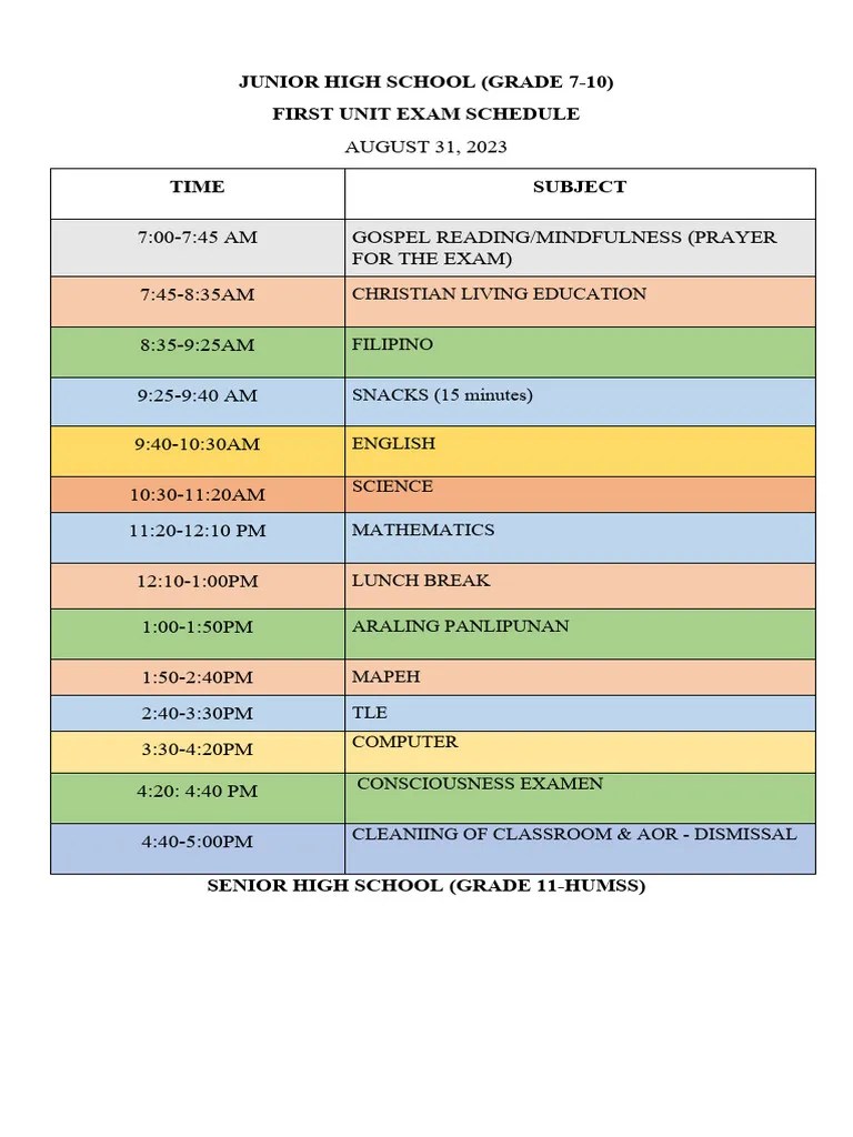 FIRST UNIT EXAMINATION SCHEDULE Updated August 302023 Download Free PDF Science