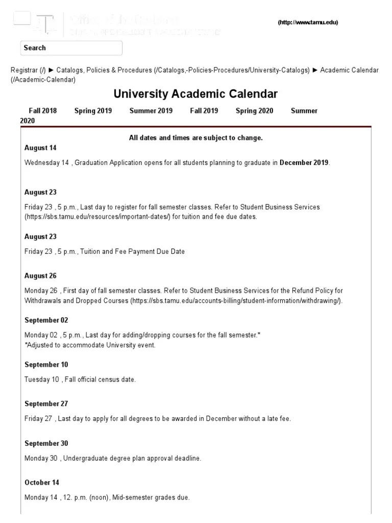 Tamu Fall Academic Calendar - *calendar is subject to change. The academic year at east texas a&m university is defined as beginning with the fall semester. Ssion courses will follow a different. Graduation application opens for all students planning to graduate in august 2024. The “download semester calendar” function captures the current semester's academic. Tuition rebate application deadline for august 2024 undergraduate degree candidates.